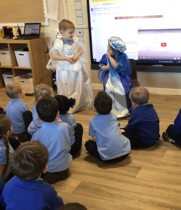 Today we listened to the story of the angel Gabriel visiting Mary to tell her that she would have a baby boy. After discussing what happened in the story, we dressed up in costumes and worked together to act it out. Everyone enjoyed taking part and bringing the story to life.
