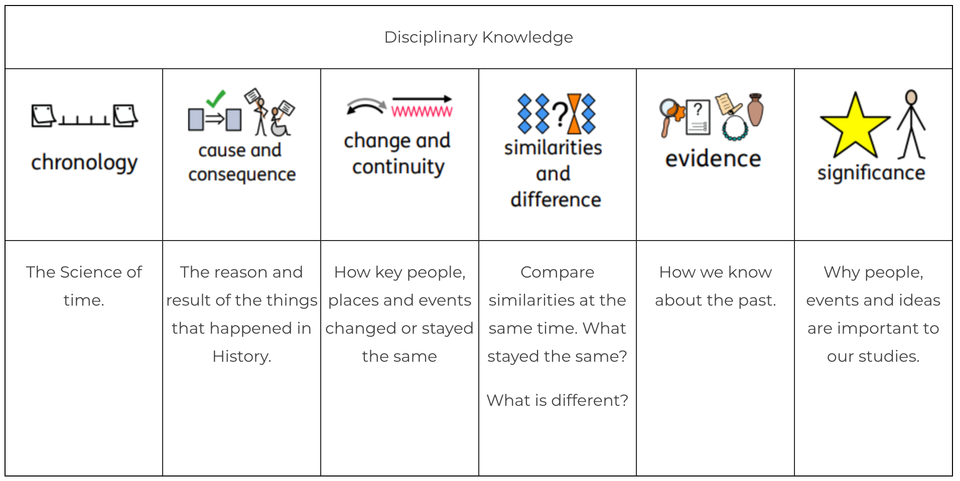 As well as developing the children's historical knowledge and vocabulary, we aim to give children the opportunity to 'think like a Historian'. This covers understanding of chronology, cause and consequence, change and continuity, similarities and differences, evidence and significance.