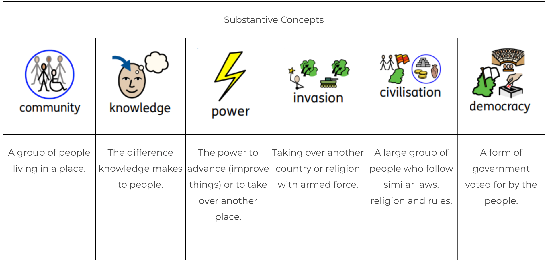 Substantive Knowledge is the content of history, the facts of people, places, events and the vocabulary used to describe them. In CUSP History, pupils build a secure and connected knowledge base so they can understand ideas such as community, knowledge, power, invasions, civilisation and democracy. Misconceptions are clearly addressed and corrected as children deepen their understanding.