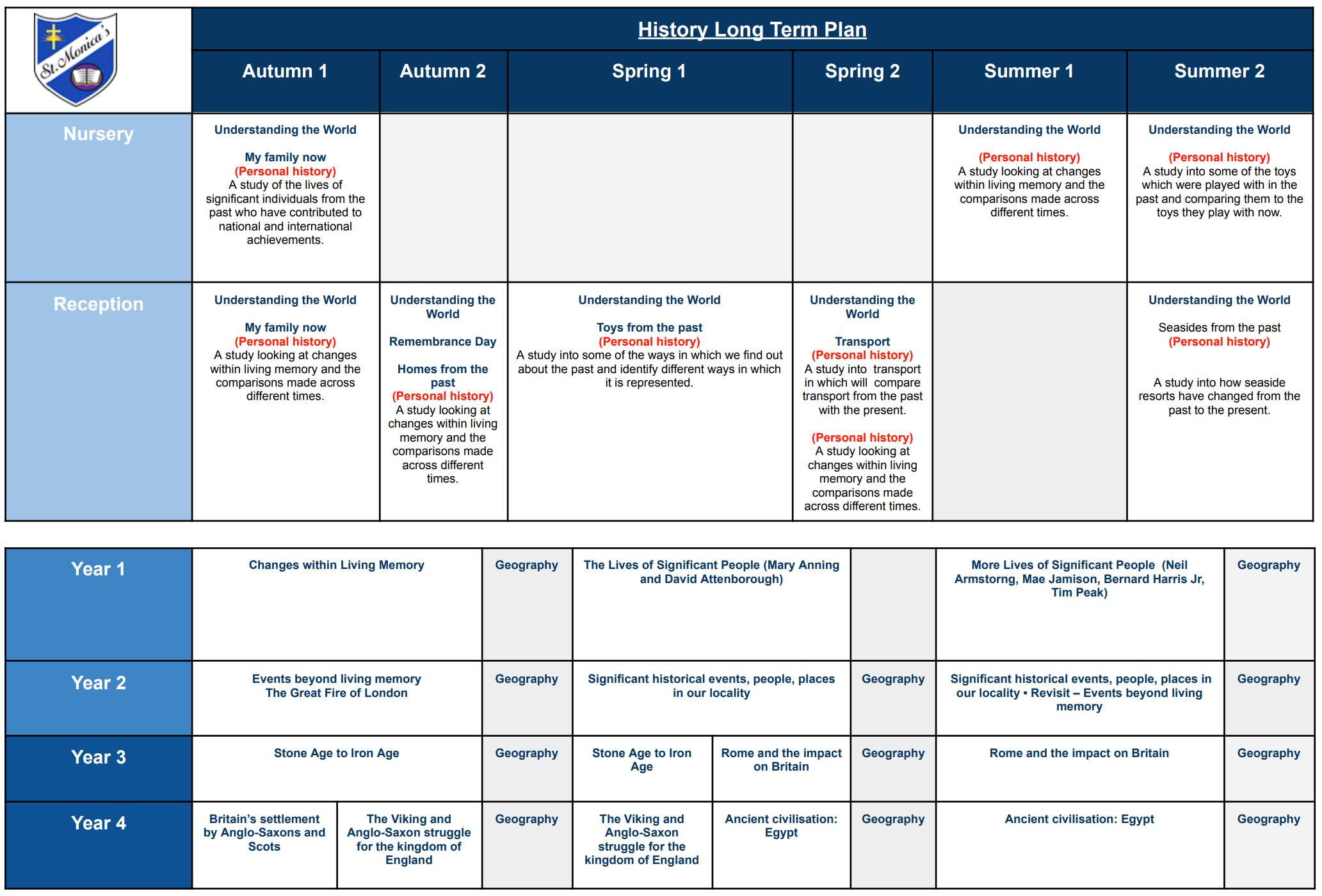 The history curriculum at St. Monica’s helps pupils to make sense of the present as well as the past. The children are equipped with historical skills and knowledge which enable them to make progress throughout the history curriculum. Children have the ability to think critically about history and communicate ideas confidently. They evaluate and challenge their own and others’ views using a range of sources to support their learning.