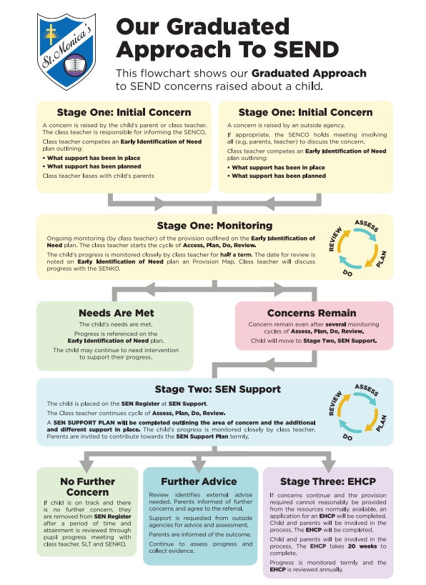 At St Monica’s, we believe that every child can succeed in a mainstream setting wherever possible. We work closely with families and the Local Authority to make sure that pupils with SEND are fully included in school life and have the best possible opportunities to reach their potential.